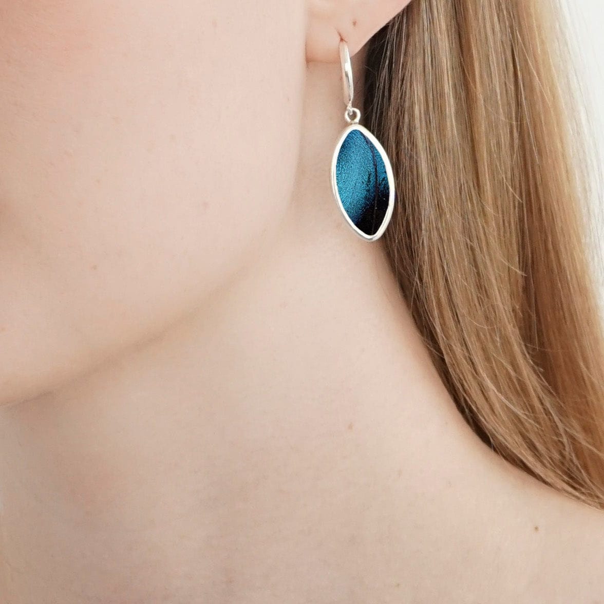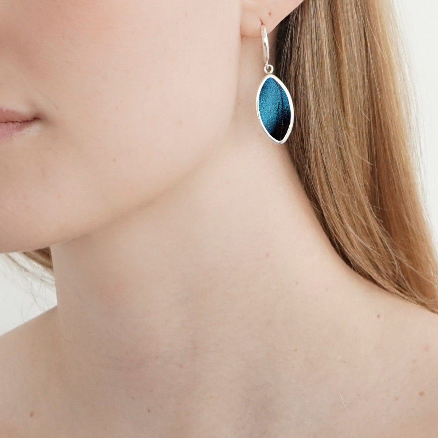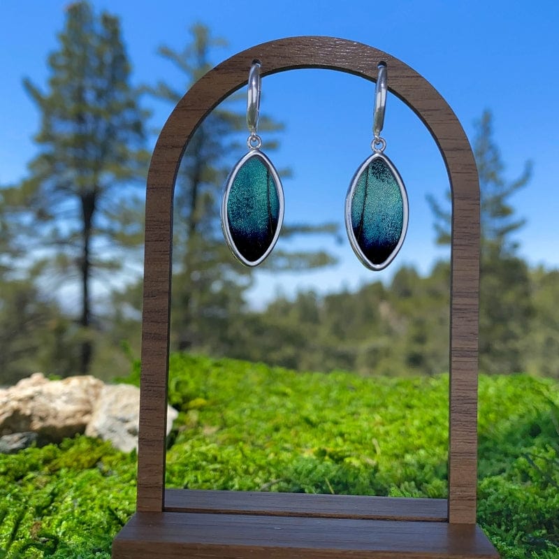 Crafted from real Morpho Achilles butterfly wings, this oval shaped earrings glows with organic movement and natural beauty. The wing’s surface shimmers with life, shifting in color and depth with every motion. Whether under sunlight or candlelight, it captures the fleeting magic of the butterfly in mid-flight. Known for its dramatic Blue-Black coloring, the Morpho Achilles creates a striking, high-contrast effect that feels both otherworldly and timeless.