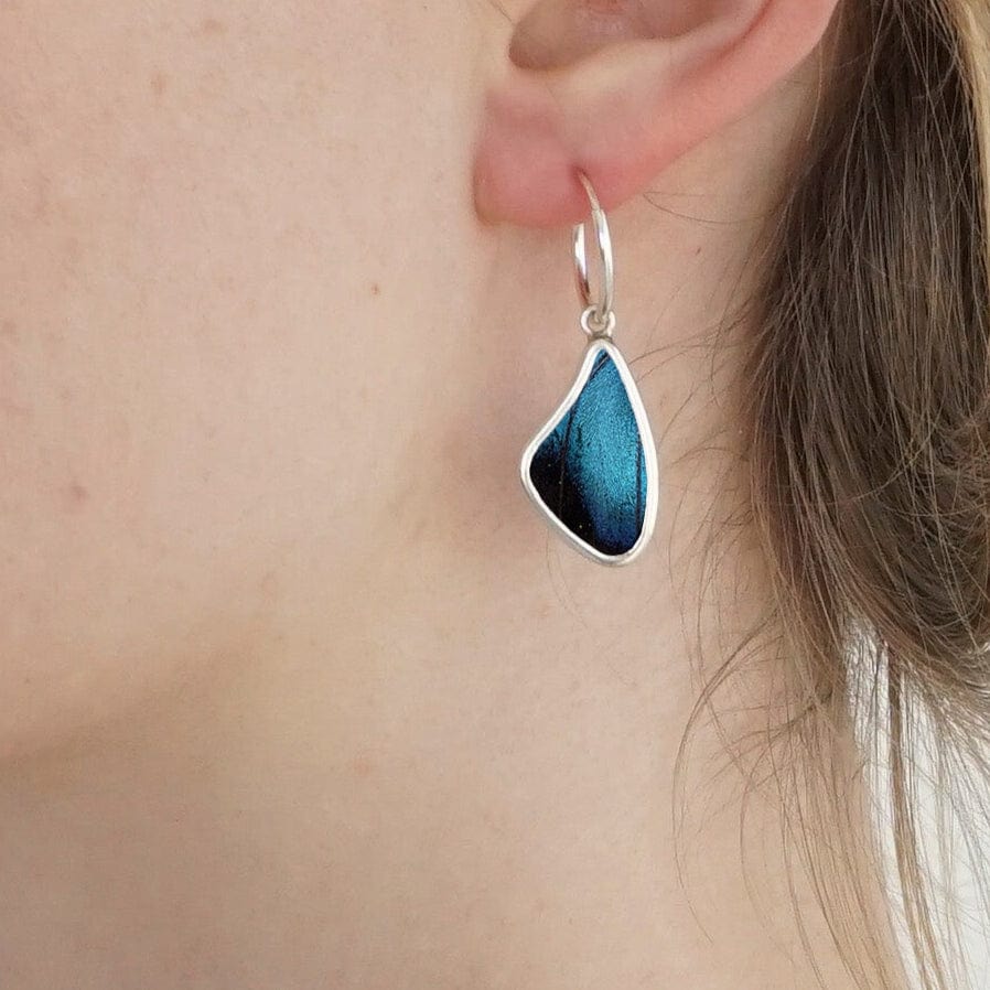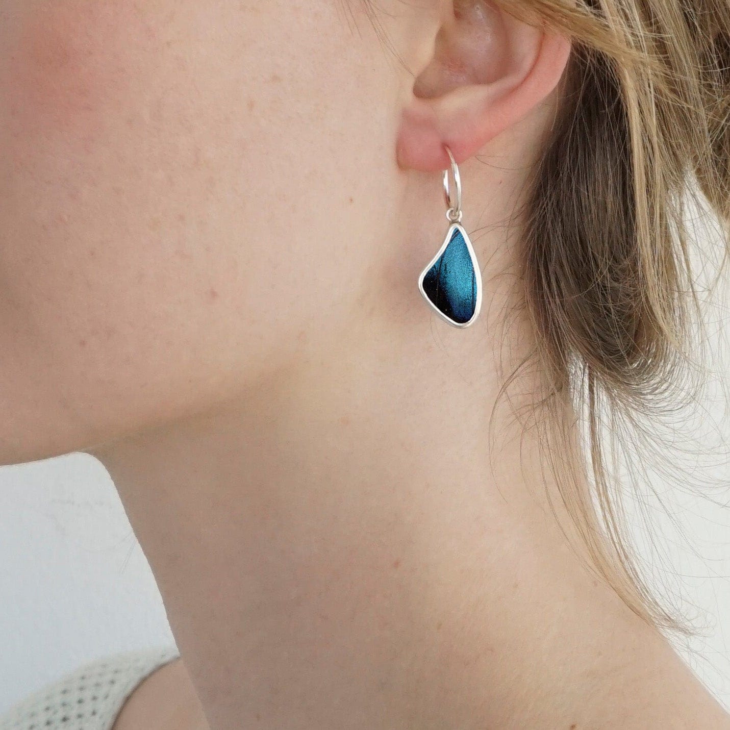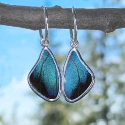 This small wing shaped earrings was made using real Morpho Achilles wings, preserved forever in sterling silver. The shape evokes graceful motion, while the coloration pulses with mystery and memory. It’s a wearable tribute to nature’s most delicate wonders.