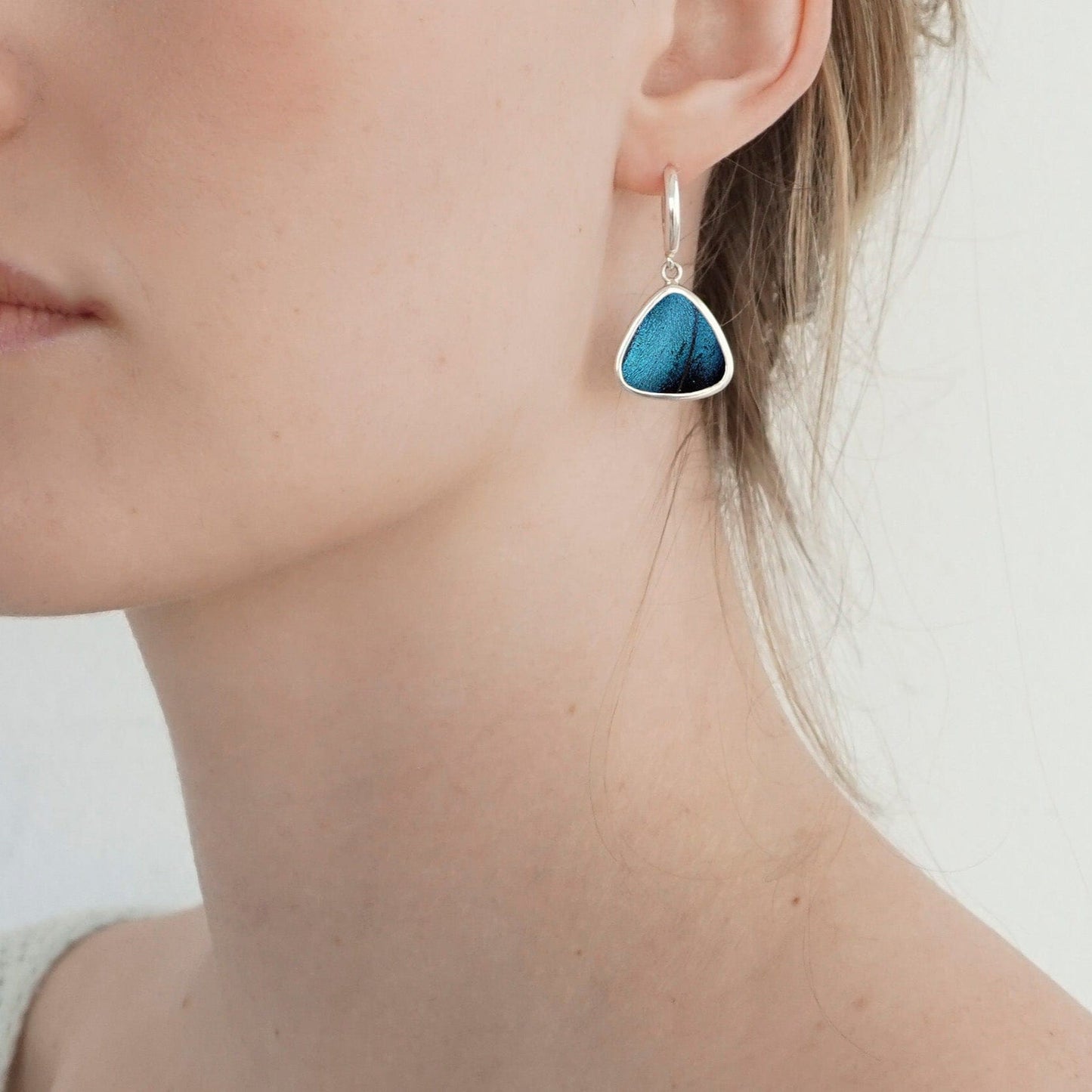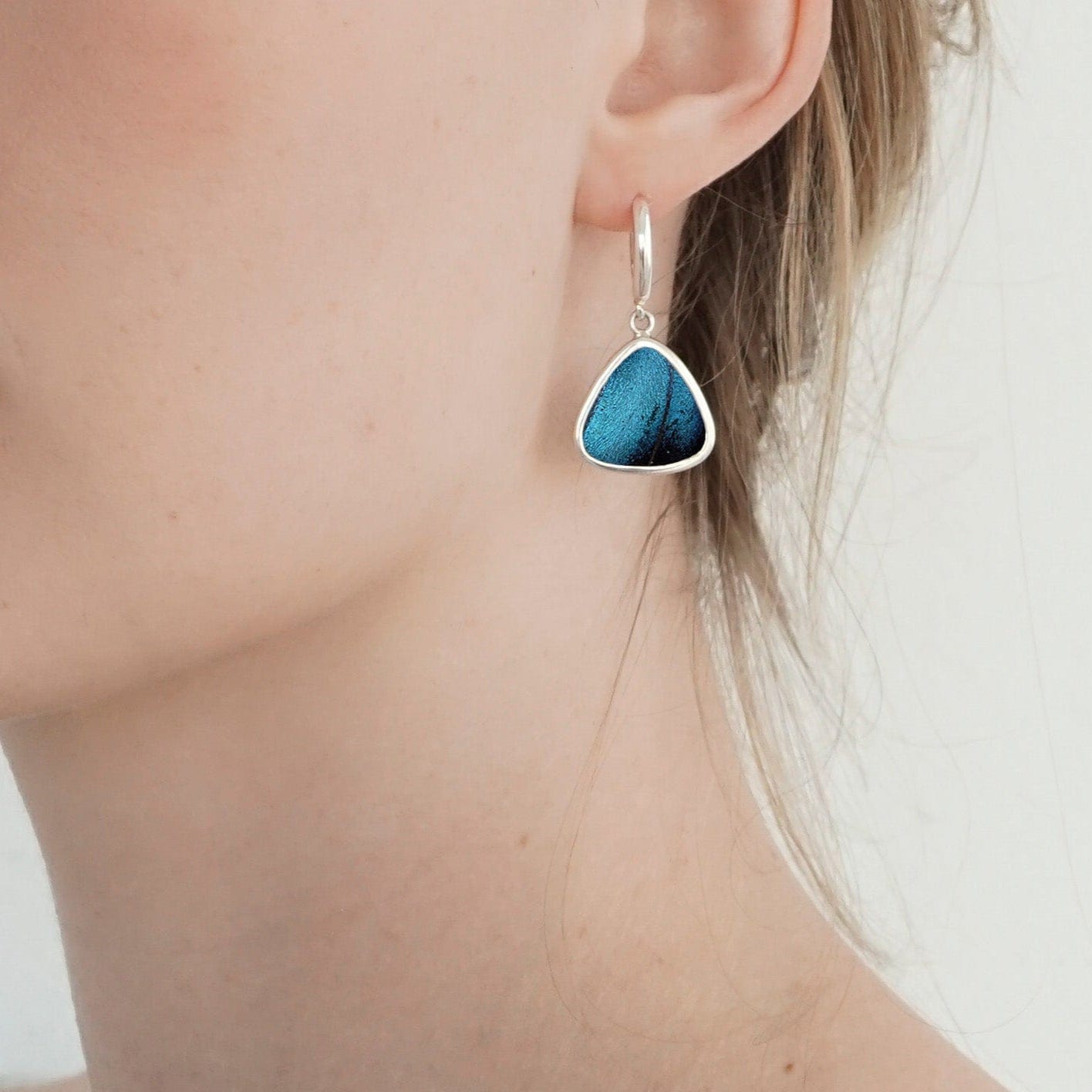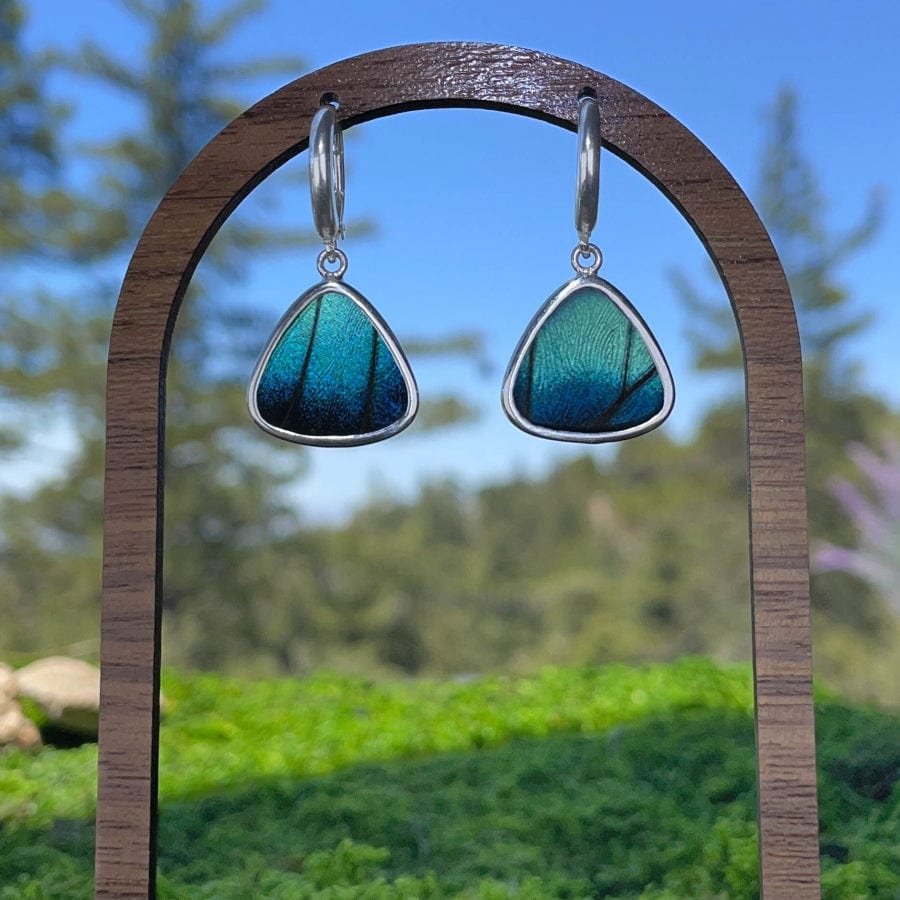 This triangle shaped earrings was made using real Morpho Achilles wings, preserved forever in sterling silver. The shape evokes graceful motion, while the coloration pulses with mystery and memory. It’s a wearable tribute to nature’s most delicate wonders.