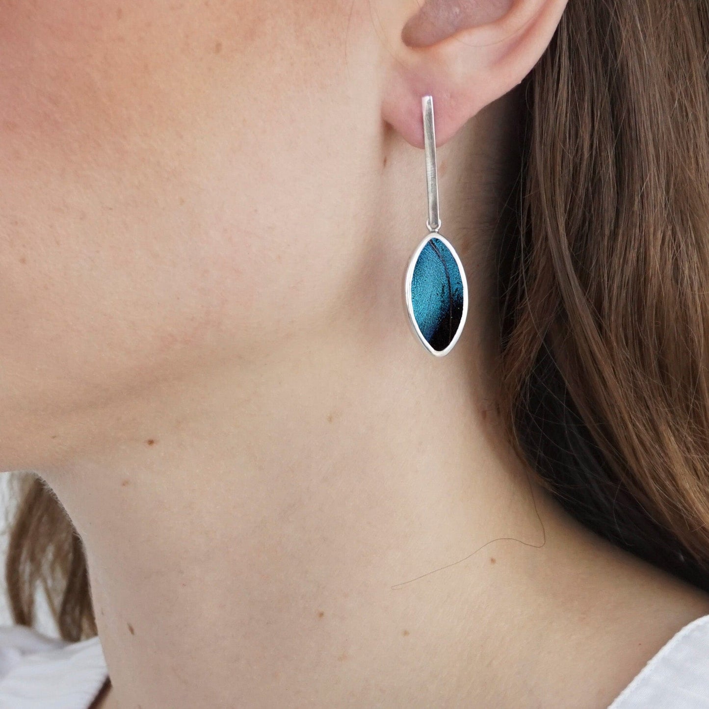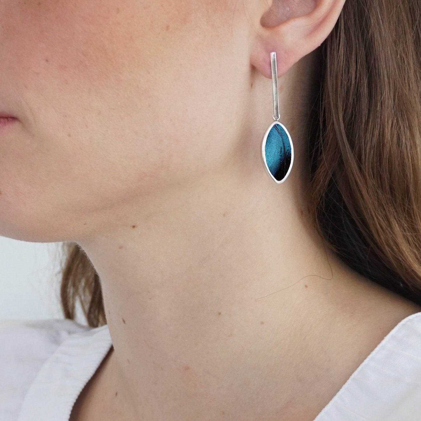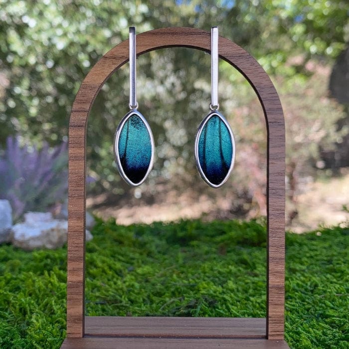 Real Morpho Achilles Butterfly Wing Oval Pendant On Flat Bar Post Earrings In Sterling Silver