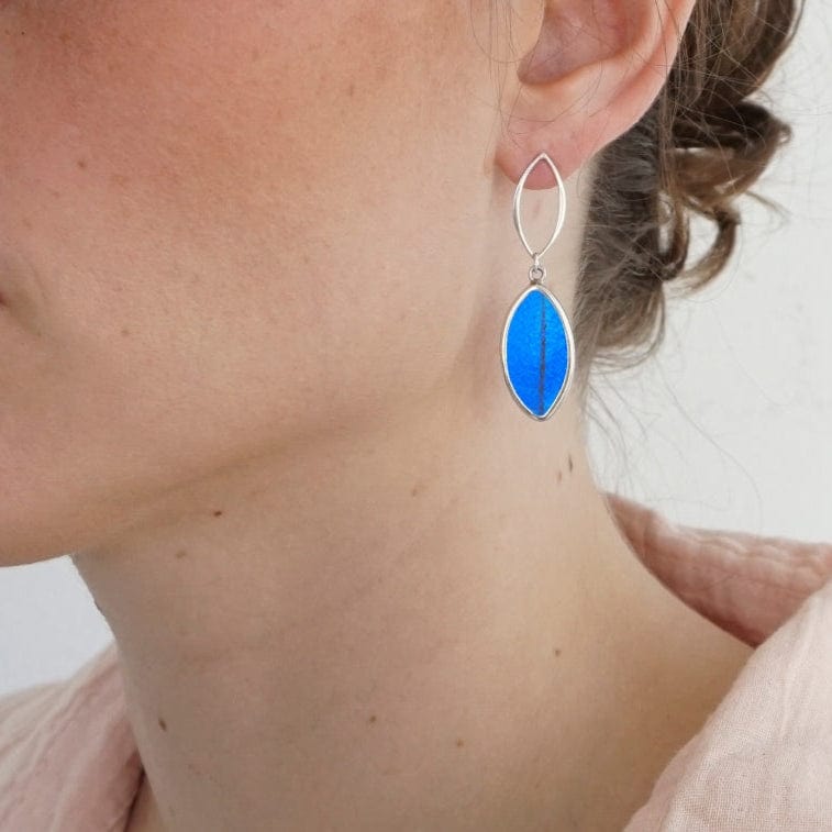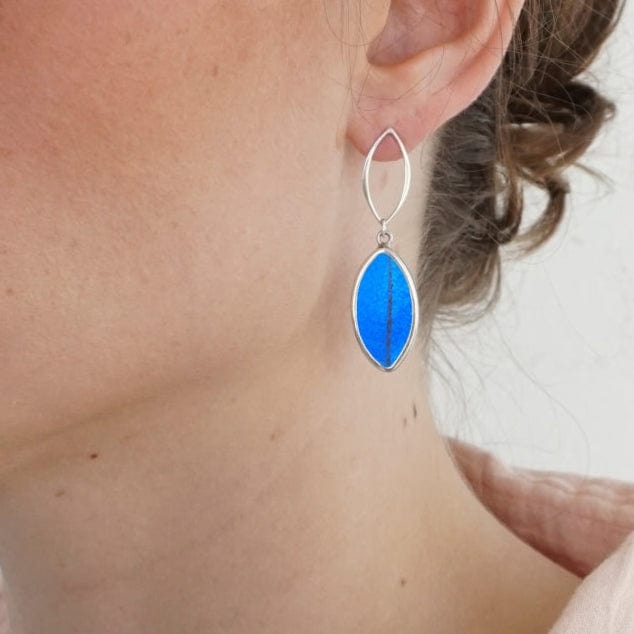 Crafted from real Morpho butterfly wings, this oval shaped earrings glows with organic movement and natural beauty. The wing’s surface shimmers with life, shifting in color and depth with every motion. Whether under sunlight or candlelight, it captures the fleeting magic of the butterfly in mid-flight. Known for its rare blue-green coloring, the Morpho creates a striking, high-contrast effect that feels both otherworldly and timeless.