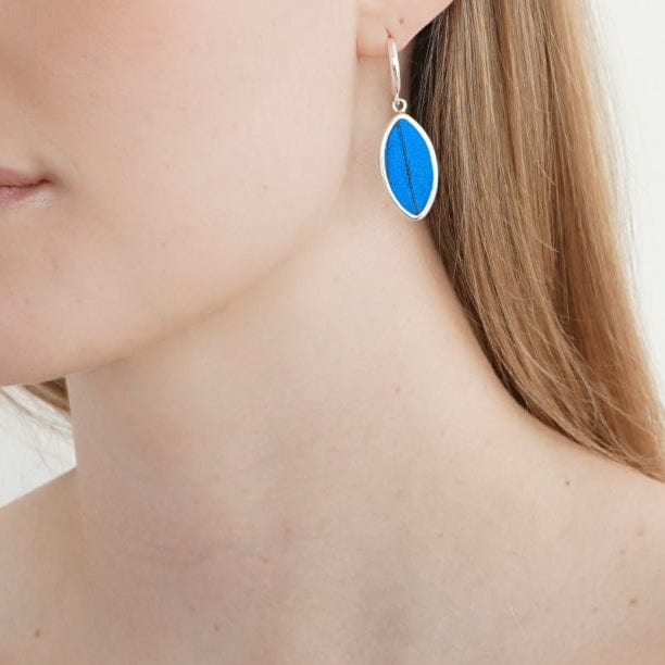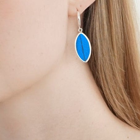 Crafted from real Morpho butterfly wings, this oval shaped earrings glows with organic movement and natural beauty. The wing’s surface shimmers with life, shifting in color and depth with every motion. Whether under sunlight or candlelight, it captures the fleeting magic of the butterfly in mid-flight. Known for its rare blue-green coloring, the Morpho creates a striking, high-contrast effect that feels both otherworldly and timeless.