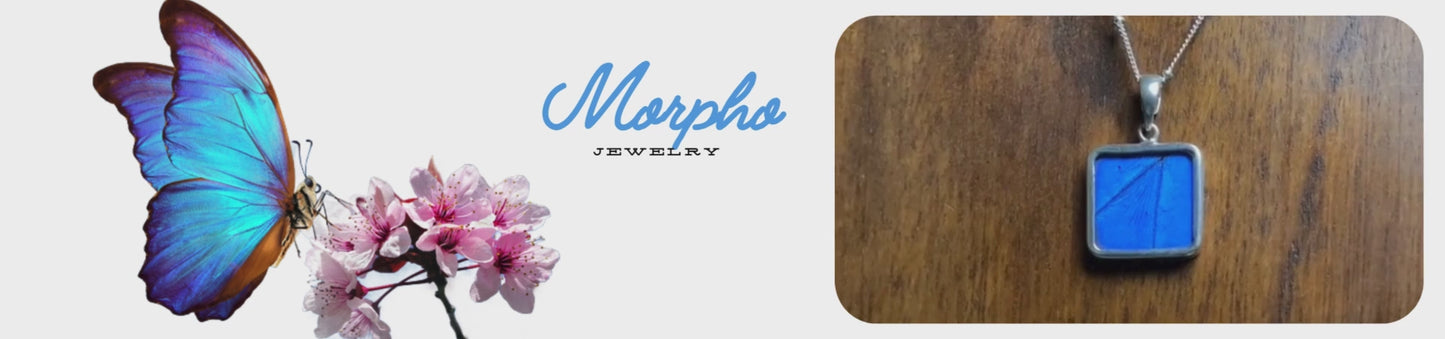 Sterling silver pendant on leverback clasp made from genuine real butterfly wings. Photo highlights blue hues and subtle patterns and delicate craftsmanship, perfect for butterfly jewelry lovers.